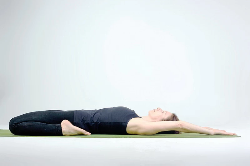 Połóż się płasko, dłonie zwrócone ku górze, stopy lekko rozstawione. Zamknij oczy i obserwuj swój oddech.Pozwól ciału się rozpłynąć. To najważniejsza pozycja na zakończenie praktyki — przynosi głęboki relaks i przygotowuje do snu.